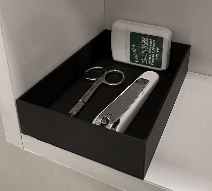 Eine einfache Aufbewahrungsschale mit den Maßen 135 x 95 x 30 mm zur Organisation von losen Gegenständen. Perfekt zur Aufbewahrung von Dingen wie Nagelknipsern, Schmuck oder Zahnseide.