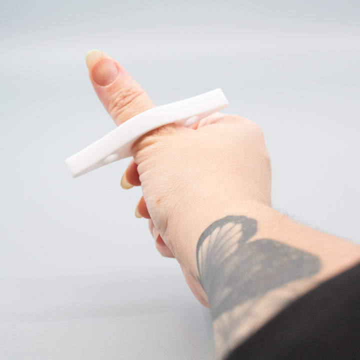 Erhältlich in 3 Größen. Dieser ist Größe L. Der Halter misst 9,5 x 3,2 cm und ist 1 cm dick. Das Loch für den Daumen misst Ø2,5 cm und ist leicht schräg, damit es ergonomisch ist, es zu halten.