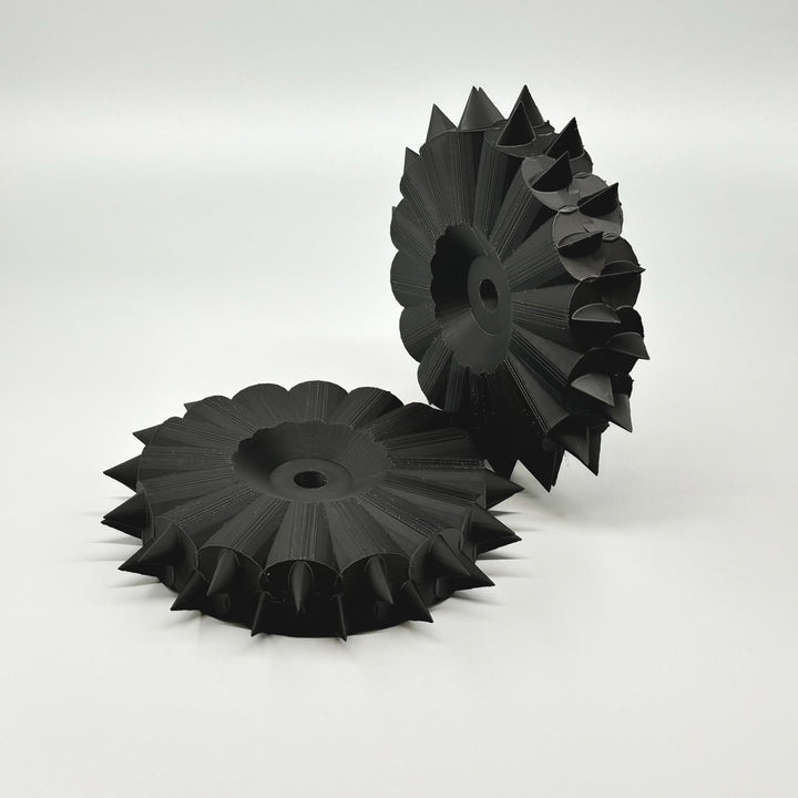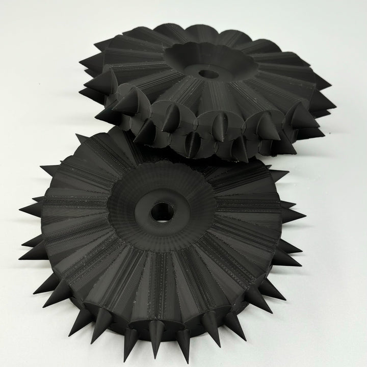 Geländereifen ausgestattet mit Spikes für deinen Kärcher RLM4 Roboter-Rasenmäher. Die Räder tragen dazu bei, dass der Roboter auf unebenem und nassem Gelände einen besseren Halt findet.