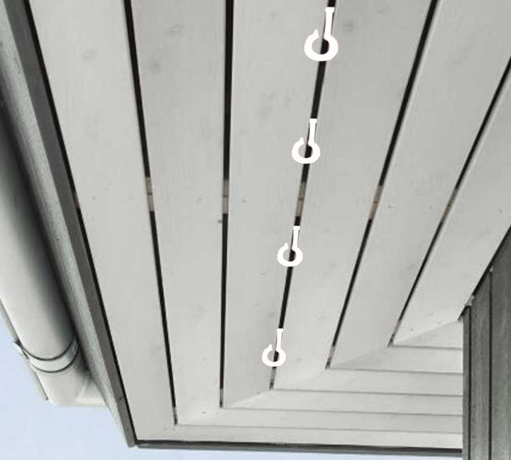 Intelligente Haken für die Dachtraufe, die es schnell und einfach machen, Gartenbeleuchtung und Weihnachtslichter am Haus aufzuhängen. Die Haken passen zu Dachtraufen mit Brettern, die einen Spalt von mindestens 5 mm haben. Diese Haken passen am besten, wenn die Bretter parallel zur Wand verlaufen.
