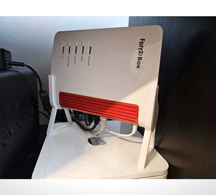 Mit dieser einfachen Halterung können Sie die FRITZ!Box 7530 aufrecht positionieren. Die beiden Beine lassen sich leicht am FRITZ-Modul anklicken, ohne Werkzeug zu benötigen, und können auf einem Tisch, einem Regal oder einem Bücherregal platziert werden.