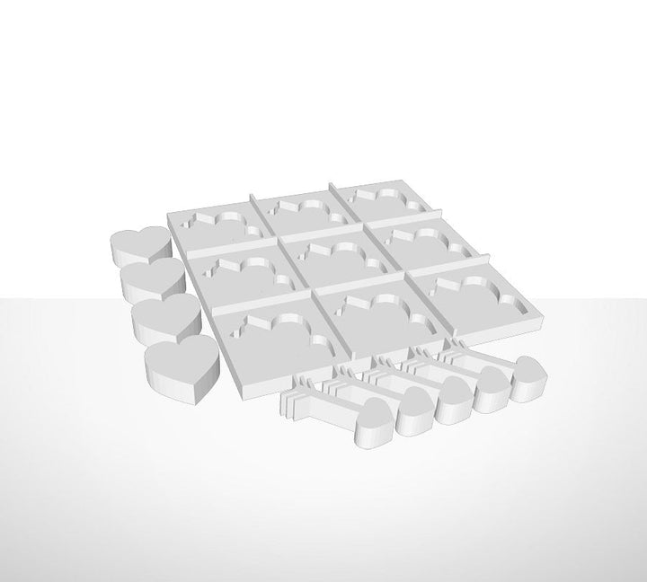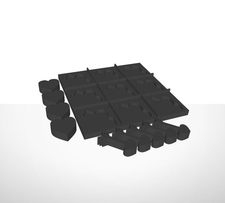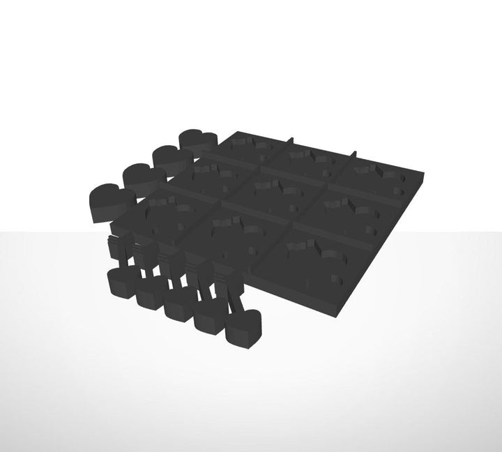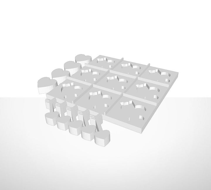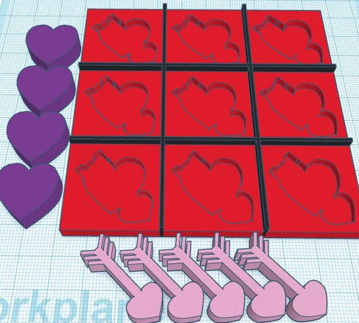 Tic-Tac-Toe Spiel in dreidimensionalem Druck. Das Spiel enthält Platte und 9 Spielsteine mit Formen wie Sonne, Herzen und Pfeile.