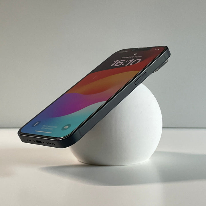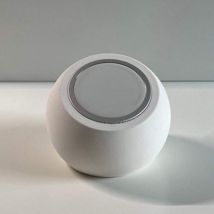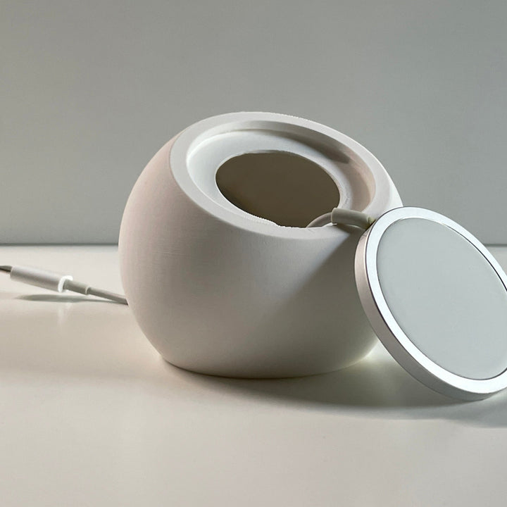 MagSafe-Ladestation-Sphäre für Apple-Produkte. Diese sphärische Ladestation dient zur Integration des MagSafe-Ladegeräts und des Apple-Ladekabels. Die Sphäre wird aus nachhaltigem Kunststoff (PLA) im 3D-Druck hergestellt.