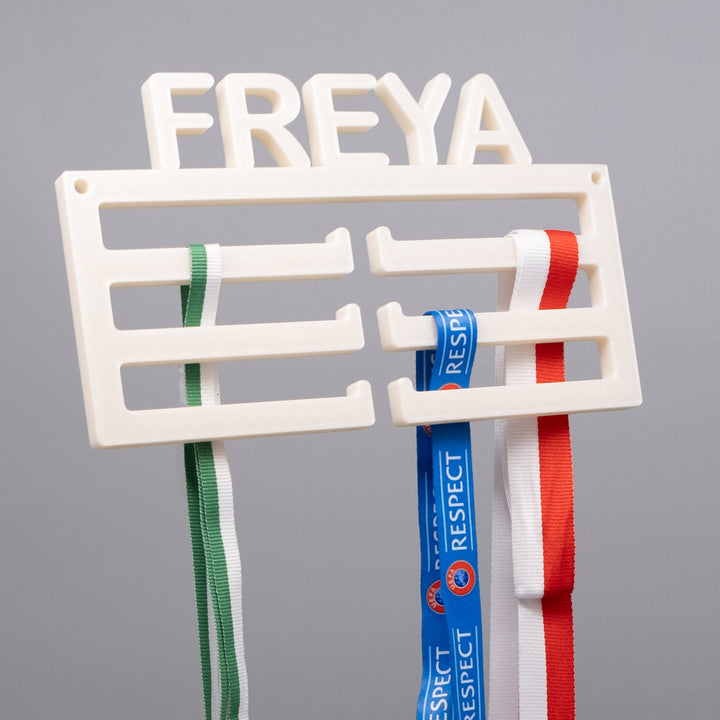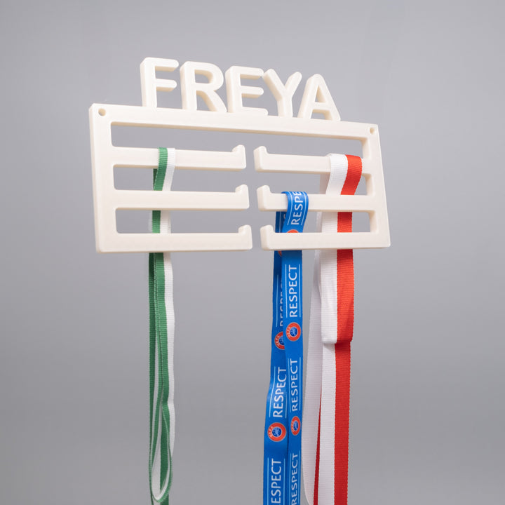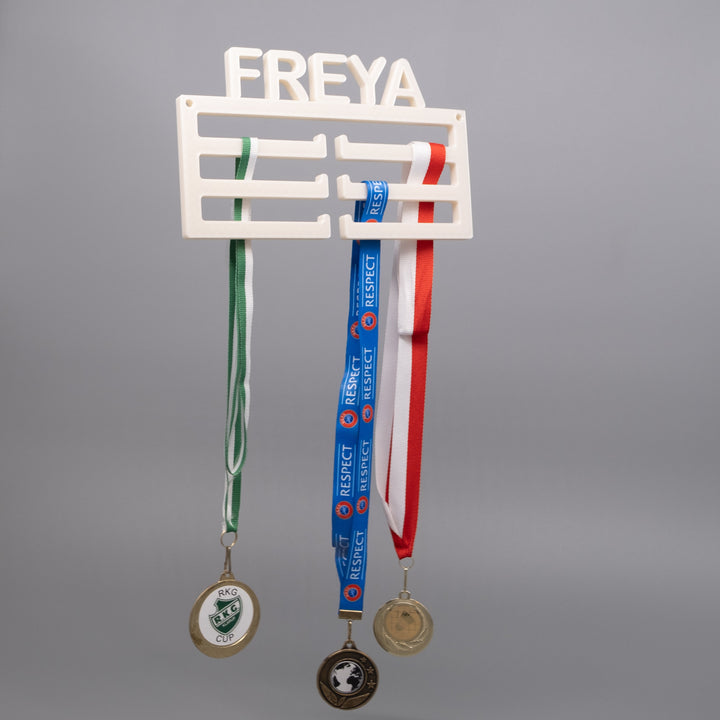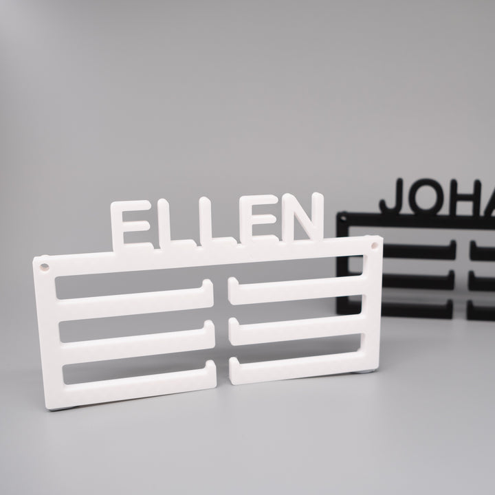 Attraktiver und persönlicher Halter für all deine Medaillen, damit sie schön an der Wand ausgestellt werden können.