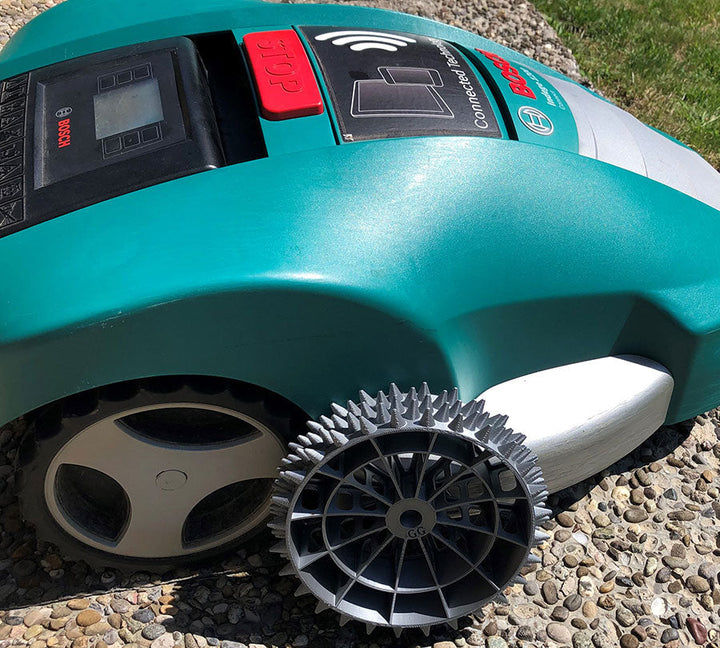 Wir haben ein praktisches Bosch Indego Geländerad entwickelt, das das ideale Zubehör für Ihren Bosch Roboter-Rasenmäher ist, wenn Ihr Rasen uneben ist oder starke Neigungen aufweist. Mit diesen Rädern wird es möglich, dass Ihr Roboter-Rasenmäher sogar steile Hügel im Garten erklimmen kann. Die Räder sorgen außerdem dafür, dass der Roboter auf unebenem und nassem Gelände besser haften kann.