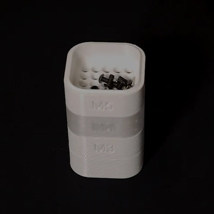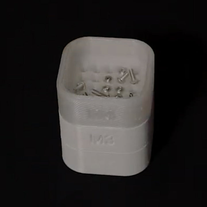Ein schnelles kleines Sortier- und Aufbewahrungssystem für metrische Schrauben und Bolzen. Stapeln Sie einfach die Siebschalen von klein nach groß (M2 - M5), gießen Sie Ihre gemischte Sammlung von Schrauben und Bolzen in die obere Schale, setzen Sie den Deckel auf und schütteln Sie kräftig von Seite zu Seite. Und das war's! Entworfen von BubsBuilds