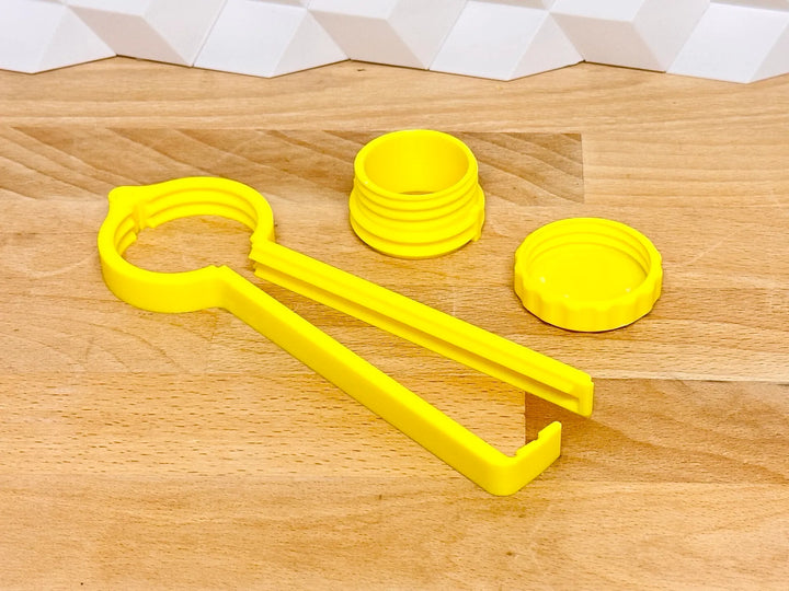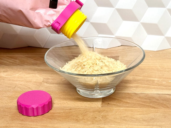 Gedruckt mit nachhaltigem PLA aus Maisstärke, also absolut sicher in der Nähe von Lebensmitteln. Montage 1. Schneiden Sie ein Loch in den Beutel (z. B. ein Loch in der Ecke, das gerade groß genug ist, um den Zylinder aufzunehmen). 2. Halten Sie den Zylinder im Loch, sodass das Gewinde herausragt. 3. Befestigen Sie den Clip um den Beutel und die Basis des Zylinders Schrauben Sie den Deckel auf
