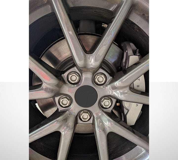 Nabenkappen für die Räder eines Tesla Model 3, mit Tesla-Logo in der Mitte. Diese werden einfach auf die originalen 18" Räder geklickt, nachdem Sie die Aero-Kappen entfernt haben.