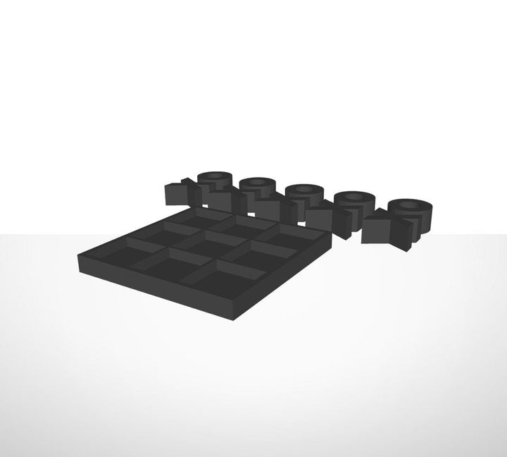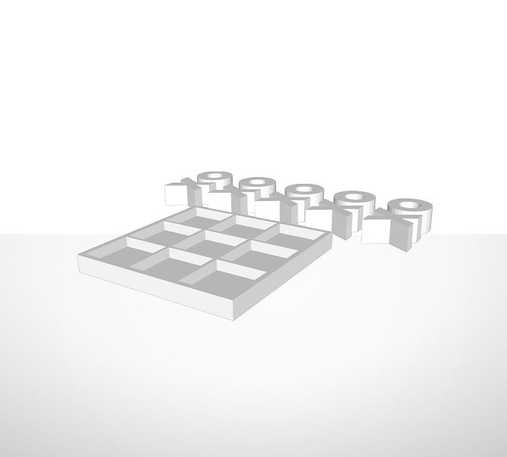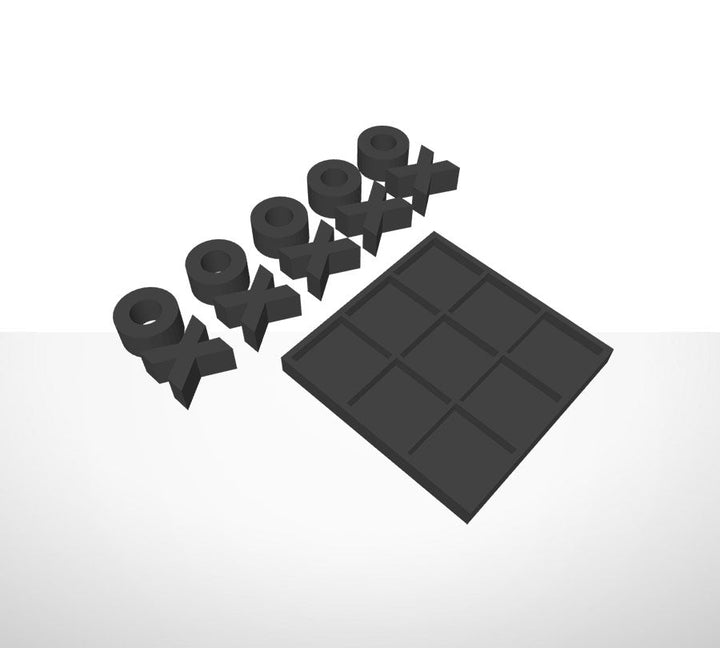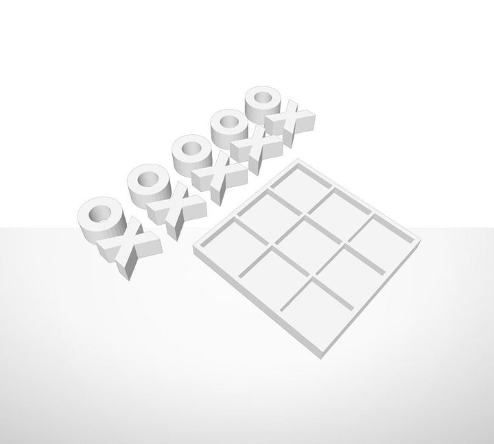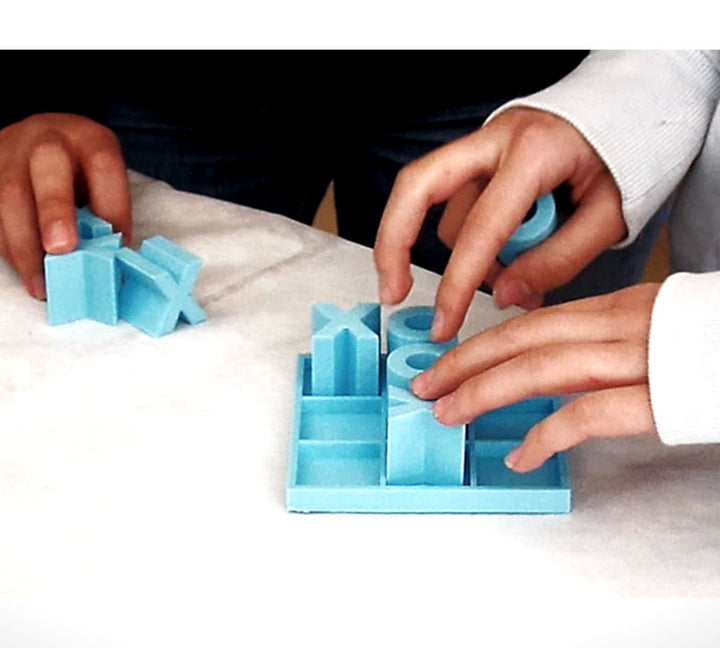 Tic-Tac-Toe-Spiel in dreidimensionalem Druck. Das Spiel enthält ein Brett und 10 Spielsteine.