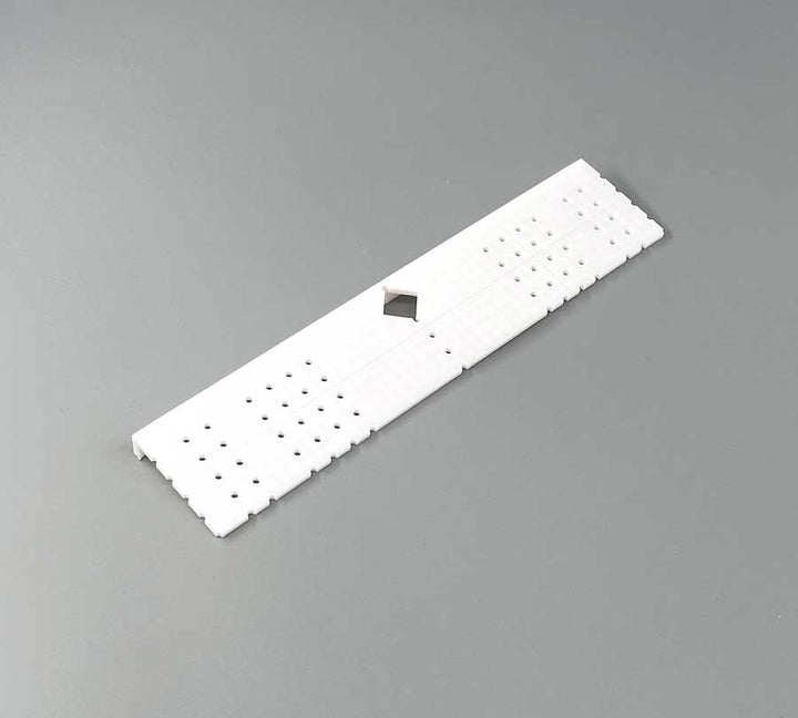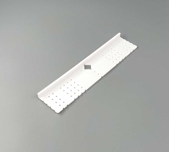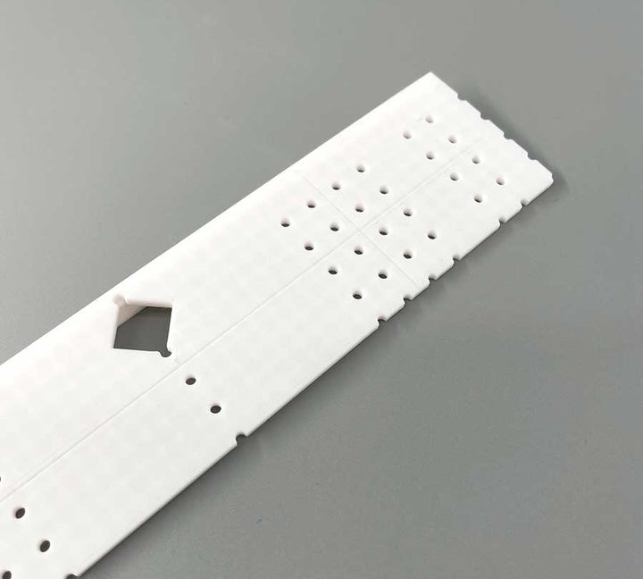 Die Schablone misst 25 cm in der Länge und 5 cm in der Höhe. Sie hat Löcher alle 10 mm sowohl vertikal als auch horizontal, passt also für die meisten Standardgriffe.