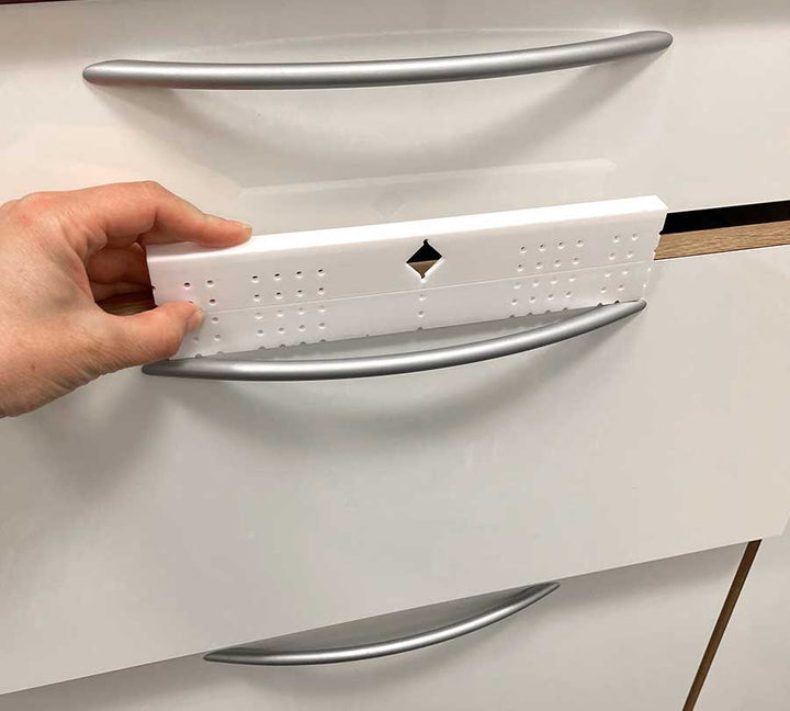 Mit dieser praktischen Schablone kannst du die Bohrlochpositionen anpassen und markieren, sodass Knöpfe und Griffe korrekt an deinen Schubladen und Türen montiert werden.
