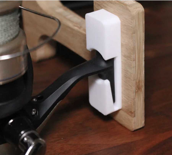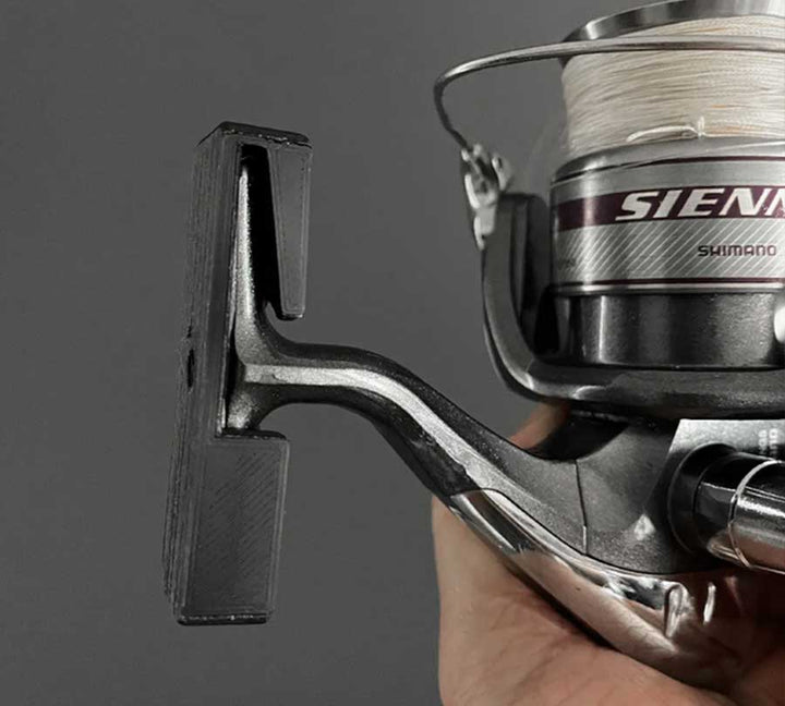 Setzen Sie Ihre Angelrolle in die Halterung ein, drehen Sie sie um 90 Grad im Uhrzeigersinn, und sie hängt nun sicher und stabil.