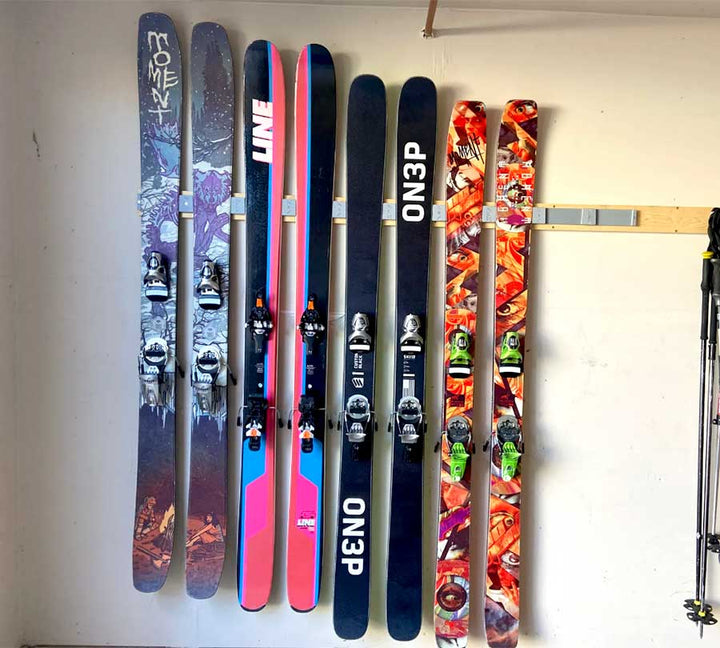 Praktische Wandhalterung für Skier. Organisieren Sie Ihre Skiausrüstung in der Garage oder im Lagerraum mit diesem praktischen Halter für die Skier. Der Halter ist für Skier mit einer Mindestbreite von 122 mm ausgelegt, um sicherzustellen, dass die Skier sicher und stabil hängen.