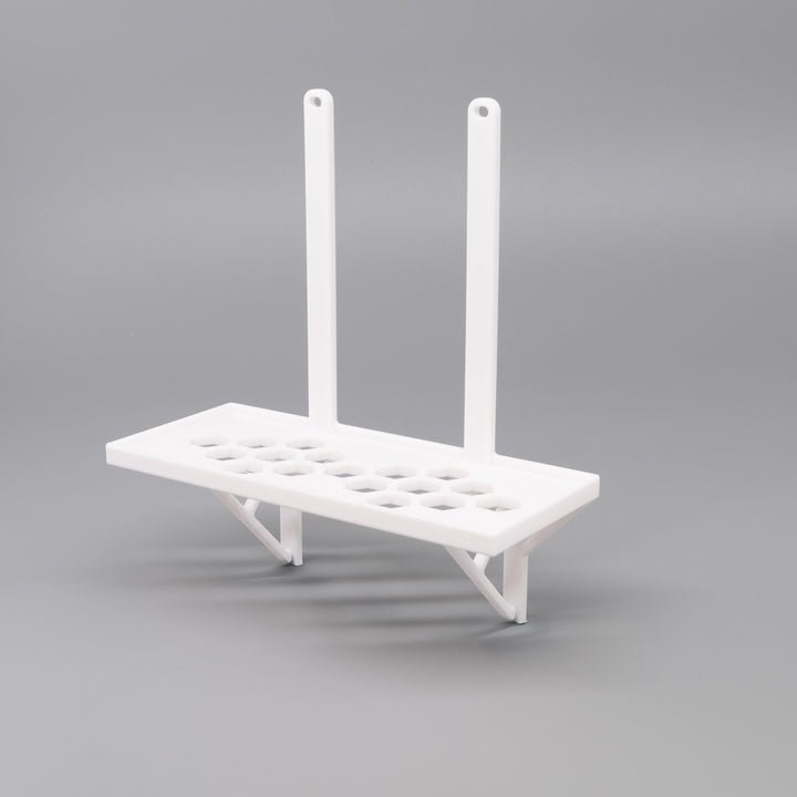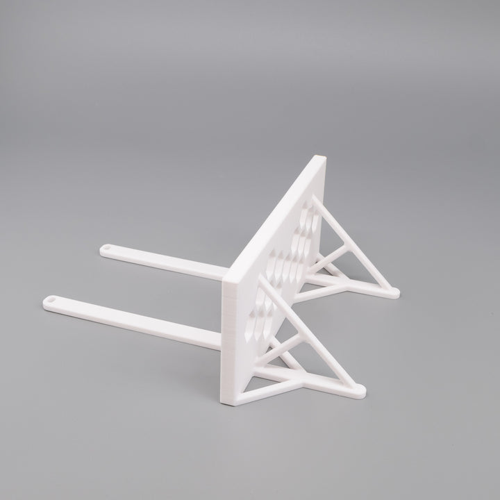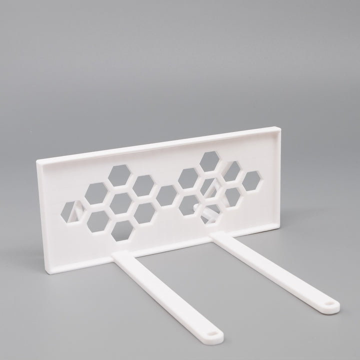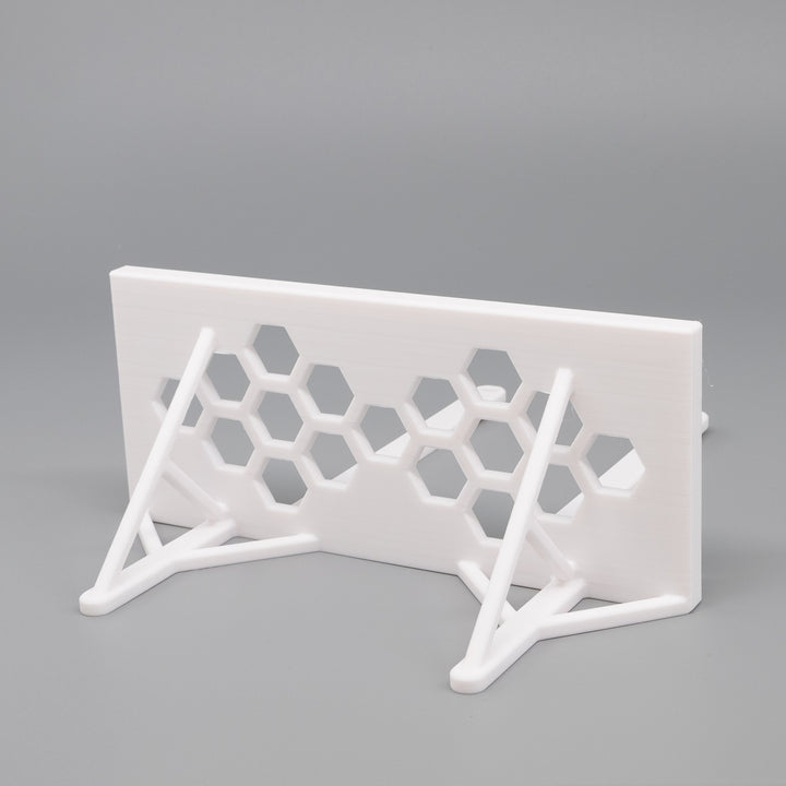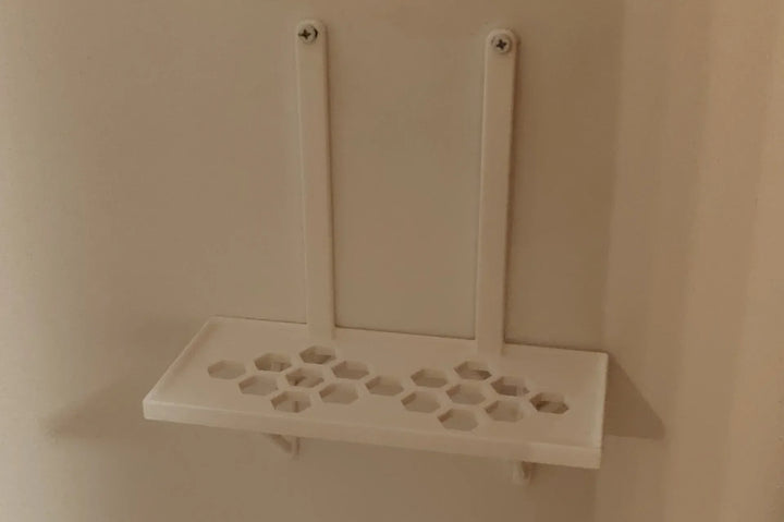 Die sechseckigen Löcher im Regal sorgen für Belüftung, da das Modem an der Unterseite Lüftungsschlitze hat. Die Bereiche ohne Löcher sind für die Gummifüße des Modems vorgesehen.